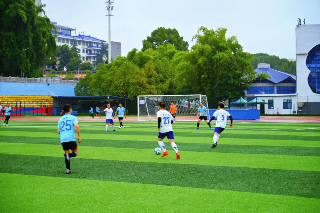 上午10:00,在学校五环运动场,两校教职工足球队进行了一场足球友谊赛。为了提升比赛的参与度,本次比赛采用三节制,每节30分钟。