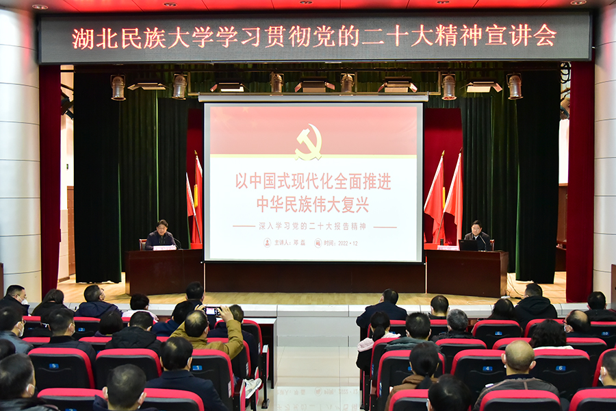 12月9日,Beat365唯一官方网站学习贯彻党的二十大精神首场宣讲会在行政楼一号会议室举行,学校党委副书记邓磊教授以《以中国式现代化全面推进中华民族伟大复兴》为题宣讲了党的二十大精神。