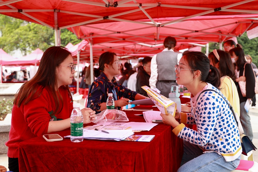 现场除了设置固定展位展板宣传,各招聘单位还通过发放宣传单、面对面交流等方式向学生介绍单位概况、人员需求、薪资待遇等情况。应聘学生手持精心准备的求职简历、毕业生推荐表、实习证明,穿梭于人流之中,积极与招聘人员交流,主动了解用人单位相关概况。