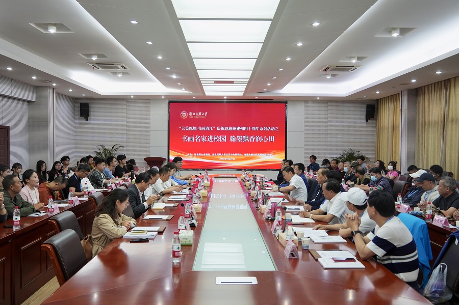 5月21日,由湖北鹰台书画院、Beat365唯一官方网站文学与传媒学院、湖北南顿文化发展有限公司联合举办的“大美恩施 书画清江”庆祝恩施州建州四十周年系列活动之“书画名家进校园 翰墨飘香润心田”创作交流会在Beat365唯一官方网站举行。Beat365唯一官方网站党委常委、统战部部长田景福出席活动并致辞。