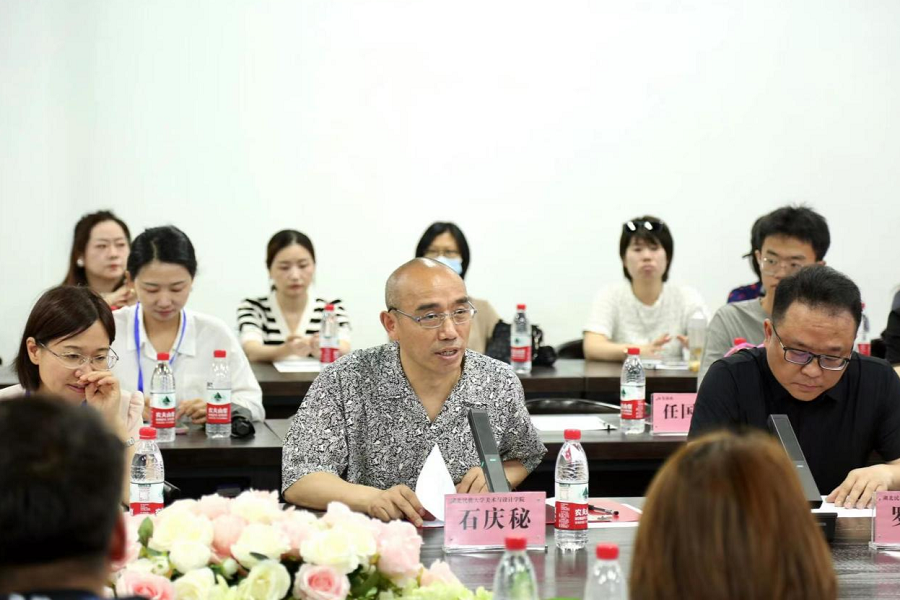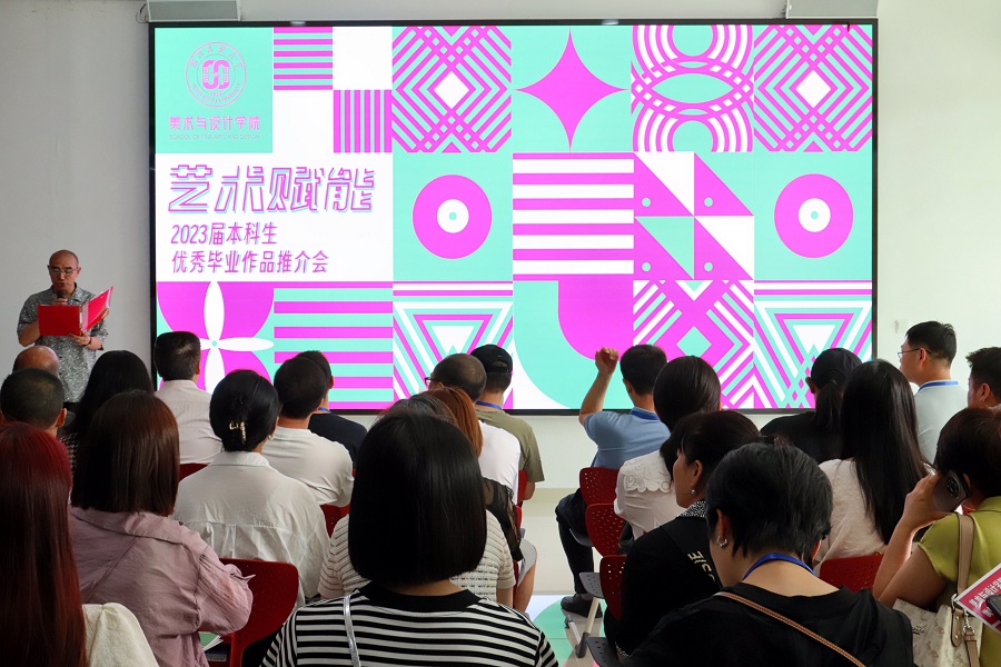 推介会包括启动仪式、参观优秀毕业作品展、开展校地校企协同研讨会三个环节。美术与设计学院院长石庆秘教授主持了启动仪式和研讨会。启动仪式上,美术与设计学院党总支书记田英致欢迎辞,2023届优秀毕业生代表黄菲菲同学发言。