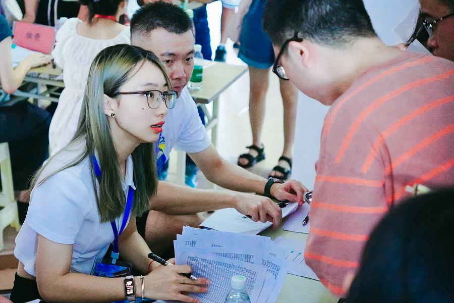 在设于行政楼一楼大厅的报到点,现场工作人员细心指导新生按报到手续办理入学事项,帮助新生快速开启新的校园生活。