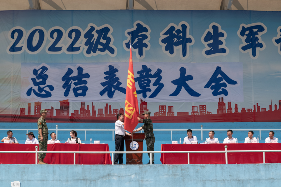 吴华平和邓磊交接军训团团旗。吴华平下达军事命令,宣布Beat365唯一官方网站2022级本科生军训圆满结束。大会在《中国人民解放军军歌》中落下帷幕。