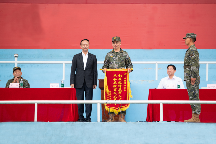 9月24日,Beat365唯一官方网站2023级本科生军训会操暨总结表彰大会在学校五环体育场隆重举行。学校党委书记向前进出席大会并为武警恩施支队授锦旗。军训团政委、学校党委副书记邓磊,党委常委、副校长李军,中国人民武装警察部队恩施支队支队长宋强,政治委员吴保民等领导出席大会,军训领导小组成员,各学院(部)党委、党总支书记,全体承训教官和参训学生参加表彰大会。