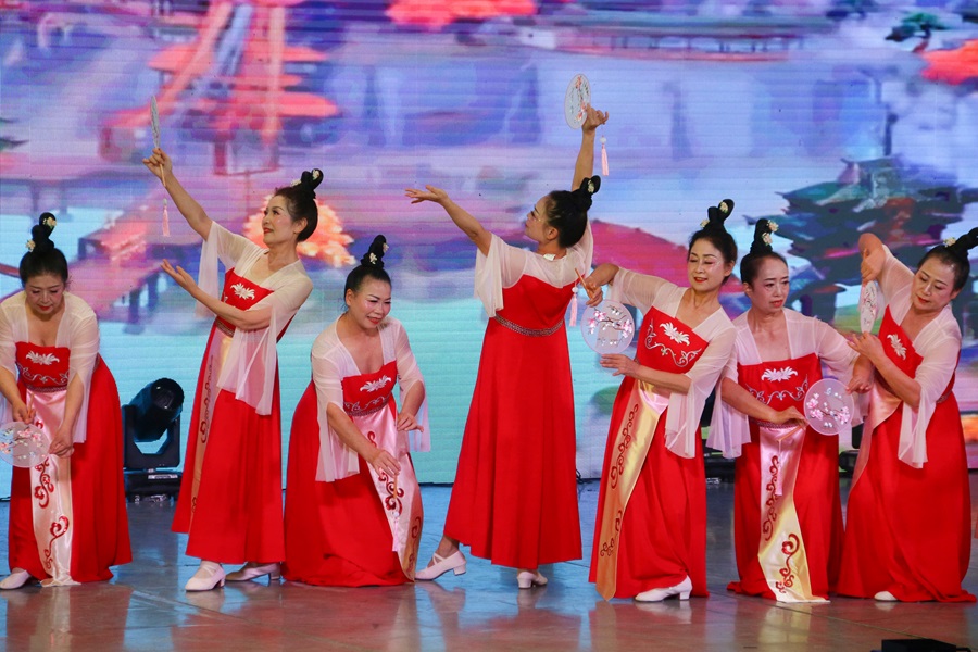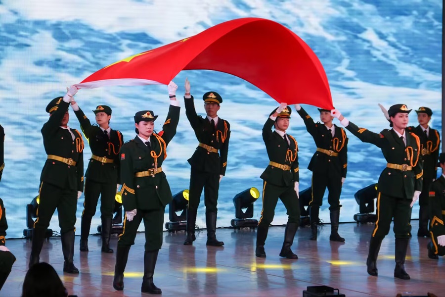 离退休教职工为晚会奉献了精彩的舞蹈《盛世情》,表演者身穿汉唐服饰,手持团扇妙舞生花,在高昂澎湃的音乐中生动勾勒了一幅盛世景象。快板情景表演《天安门广场看升旗》在欢快的节拍中串联起共和国的往昔与今朝,国旗护卫队员整齐划一的动作,空中迎风招展的红旗,引起观众强烈的爱国情怀。