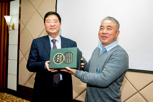 校友代表(常务副会长赵恳)向母校赠送纪念品——青铜鼎