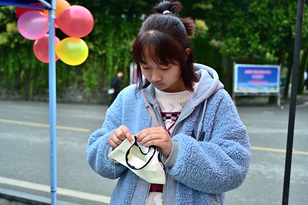 活动现场设置展棚若干,热闹非凡。本次活动以参与者为T恤、帆布包等缝制图案的形式展开,现场有布贴、扣子、蝴蝶结等装饰品供学生选择。在工作人员的指导下,学生围坐一起,一手持针线,一手拿T恤,动作连贯流畅,手法娴熟,在一推一拨中感受手工制作的乐趣。活动中,学生还用彩色丝线绣出五角星、玩偶等图样,通过别具匠心的刺绣方式吸引众多学生积极参与,以一丝一线彰显出爱与真情。