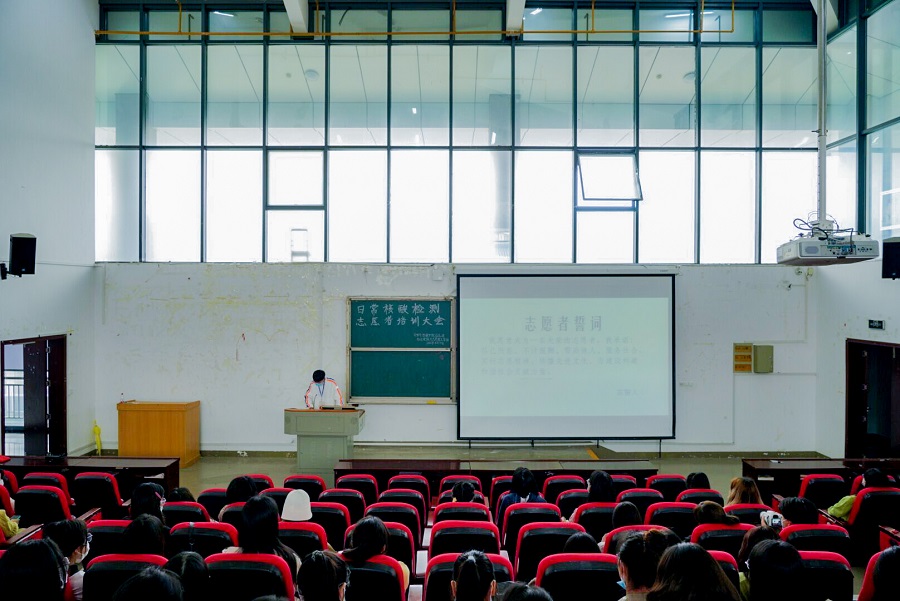 主持人带领青年志愿者宣誓。随后,社会实践与志愿者工作部副部长邱可欣进行志愿者核酸检测培训。培训主要从“登记核验”“棉签分发”“医护协助”“维持秩序”四个方面依次进行讲解。“登记核验”分为健康码登记和身份证登记,志愿者利用核酸检测专用程序进行信息登记及身份核验;“棉签分发”方面,志愿者需要按照信息登记的顺序进行棉签的分发;“医护协助”方面,志愿者主要工作是协同医护人员完成试管收集、做好样本回收;“维持秩序”方面,志愿者需要组织和引导师生排队、登记、完成核酸检测。最后,邱可欣列举核酸工作中可能出现的突发问题并提出相关建议。