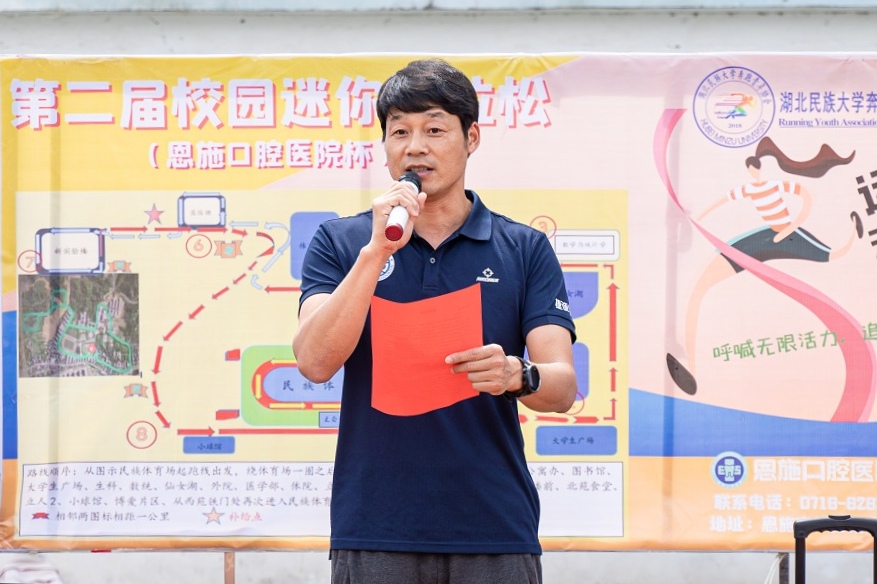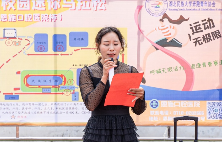 5月22日,奔跑青年协会、校卫队和体育学院学生会在民族体育场联合举办以“呼喊无限活力,追逐青春赛道”为主题的第二届“校园迷你马拉松”。体育学院党总支书记何斌,校团委副书记向驰,体育学院党总支副书记万利,团总支书记张弋明,奔跑青年协会指导老师陈芬,恩施口腔医院院长谭华玲受邀出席本次活动。