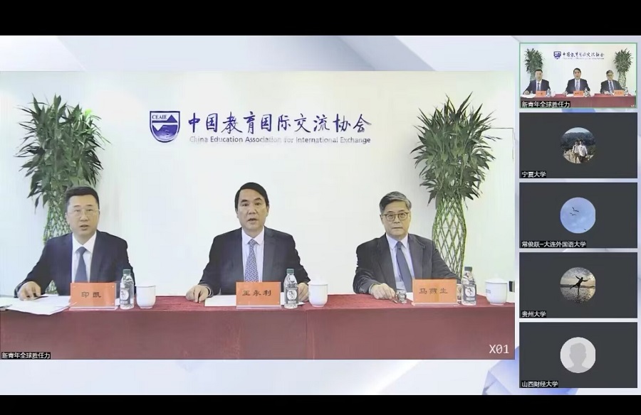 随后,全体师生参加了由中国教育国际交流协会组织的全国“新青年班”线上开班仪式。中国教育国际交流协会秘书长王永利,北京外国语大学原副校长、中国驻法国使馆前公使衔教育参赞马燕生出席线上仪式并致辞,鼓励青年学生立足中国,放眼世界,努力学习,勇于担当,在世界百年未有之大变局的时代背景下不断提升全球胜任能力。华北电力大学党委书记周坚作为项目院校代表、北京大学国际关系学院教授王勇作为项目师资代表、中南民族大学教师胡新丽作为优秀班主任代表、上海大学学生左维作为优秀学生代表一一发言。西安交通大学常务副校长郑庆华、中国人民大学党委常委、副校长杜鹏、江苏大学党委常委、副校长赵玉涛、北京中医药大学校长助理、研究生院常务副院长张立平等分别就高校国际化与“新青年”项目开展做主题汇报与经验分享。