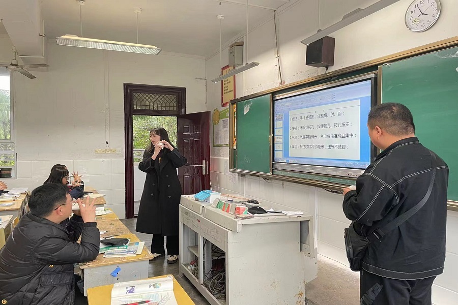 乐理课堂上,团队成员详细生动的讲解使在场学生在欢笑中学习到新的乐理知识;手工课上,团队成员手把教授学生制作纸质版十二指陶笛,让学生在实践中接触到非常见乐器并感受乐器所带来的独特魅力;音乐课堂中,团队成员将拍桌舞与流行音乐融合,展现出新的趣意,。团队成员与学生相处融洽,课堂一片欢声笑语。