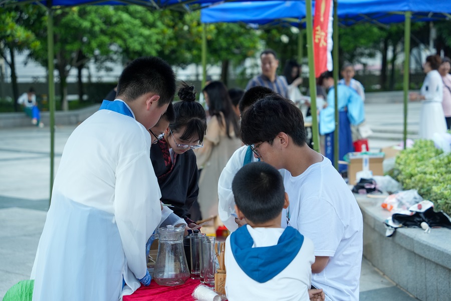 当天下午,茶文化协会与非物质文化遗产研习学社在大学生广场与实验小学学生开展户外活动。