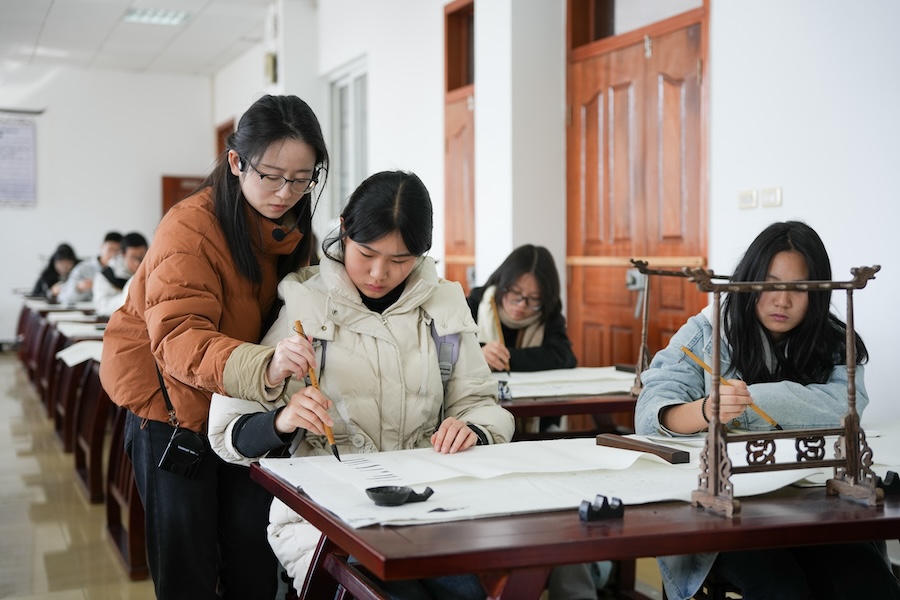 在教师教育学院,老师为学生带来一堂毛笔书法课。老师从“握笔技巧”和“笔法驾驭”出发,由浅入深,让学生通过感受笔墨的变化,认识到线条的生命力,体会到书法的魅力。
