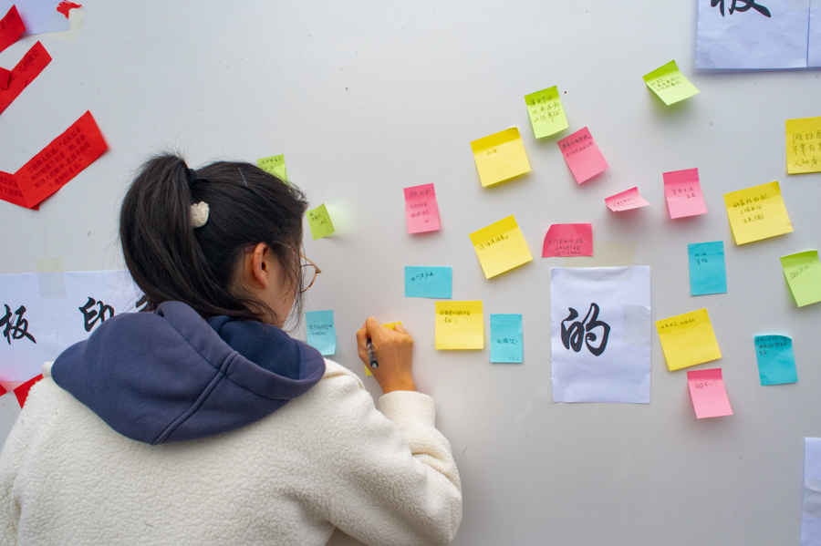 颁奖仪式后,线下活动吸引众多学生参与。参与者撕下展板上的恶意标签,改变对艾滋病患者的刻板印象,与贴有“我有艾滋病,可以和我拥抱吗”的人偶拥抱,通过拥抱的方式传达对艾滋病患者的理解和尊重。现场设置科普艾滋病相关知识展区,参与者在问答中提升对艾滋病的认识水平和预防能力,并在便签上写下积极、充满正能量的鼓励话语,传递出温暖与真情。