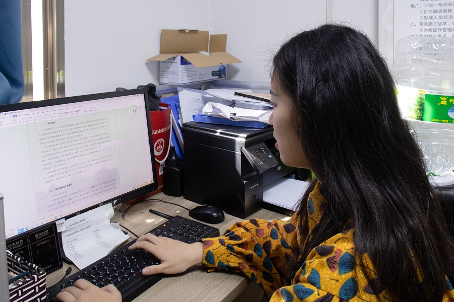 甘丽祯在创业基地项目办公室处理日常事务