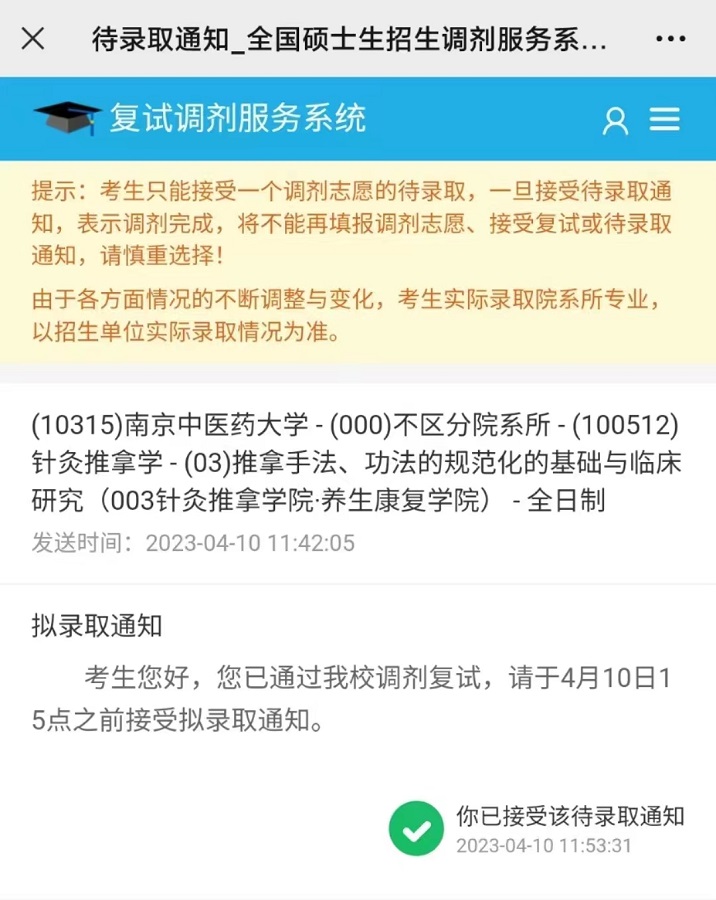 南京中医药大学研究生录取通知
