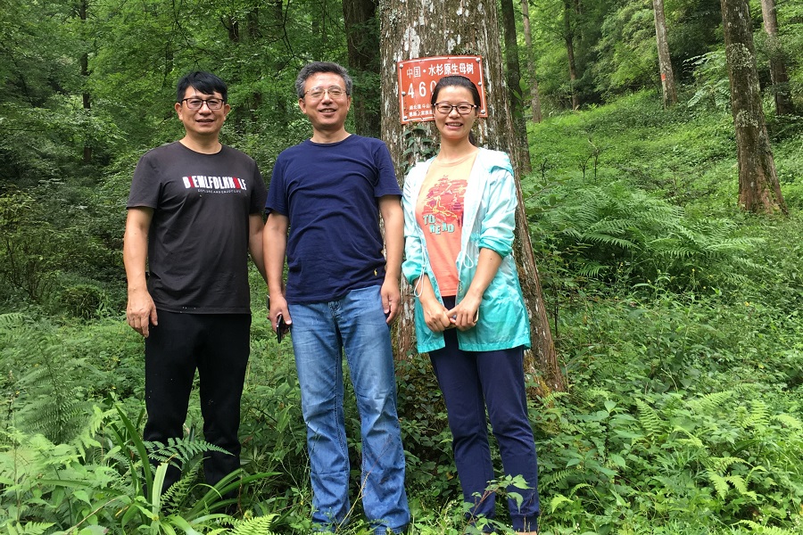 姚兰(右一)陪同华东师范大学陈小勇教授(中)考察水杉原生母树