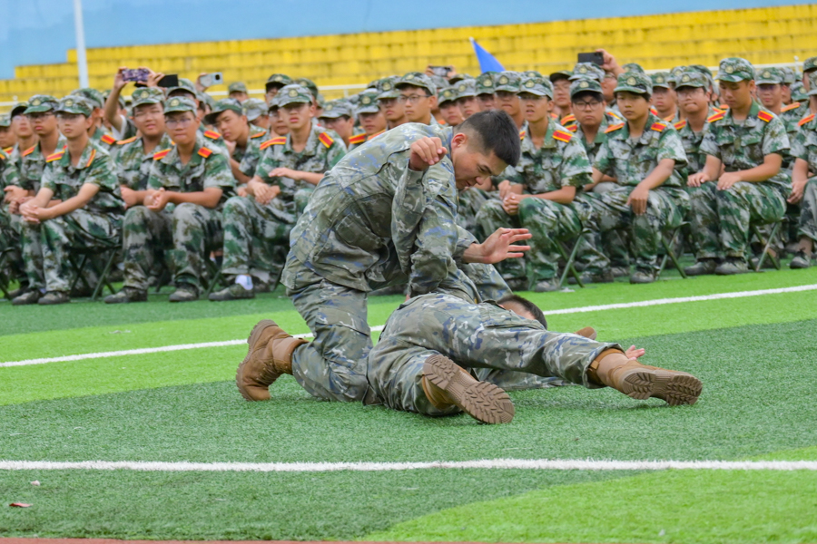 在庄严肃穆的国歌声中,大会正式拉开帷幕。承训教官作擒敌拳、刺杀操等军事科目表演,以过硬的军事素质和顽强的军人作风,展现出了英姿飒爽的军人风采,赢得全场师生热烈掌声。