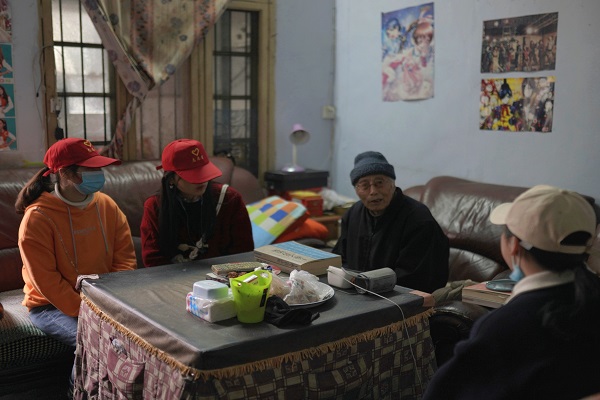 志愿者分为孤寡老人和留守儿童两个小组。第一组志愿者来到老人潘荣成家中,老人对志愿者的到来表示欢迎。志愿者与老人围坐在一起,听老人讲述自己的孙子孙女。老人询问志愿者的年龄、成绩,分享对学生就业的看法,他建议大学生认真学习专业知识,多掌握几门语言,为今后自身的就业提供优势;另一组志愿者来到小朋友杨紫伊家中,辅导她的假期作业,志愿者用不同的思路讲解题目,让小朋友更清晰地理解并掌握知识,使其感受爱与温暖。