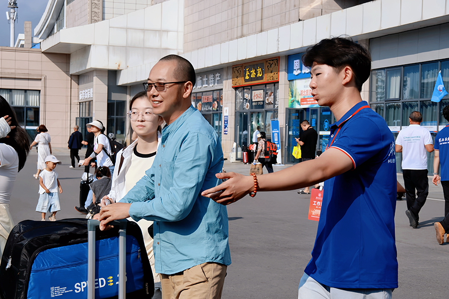 志愿者在火车站引导家长和新生