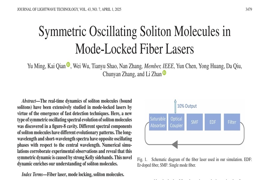 4月1日,Beat365智能科学与工程学院光电信息科学与工程专业2021级学生明雨以第一作者身份在中国科学院一区Top期刊(2023年中国科学院文献情报中心期刊分区表)《光波技术杂志》(《Journal of Lightwave Technology》)(影响因子4.1)发表了题为《锁模光纤激光器中的对称振荡孤子分子》(“Symmetric oscillating soliton molecules in mode-locked fiber lasers”)的学术论文。