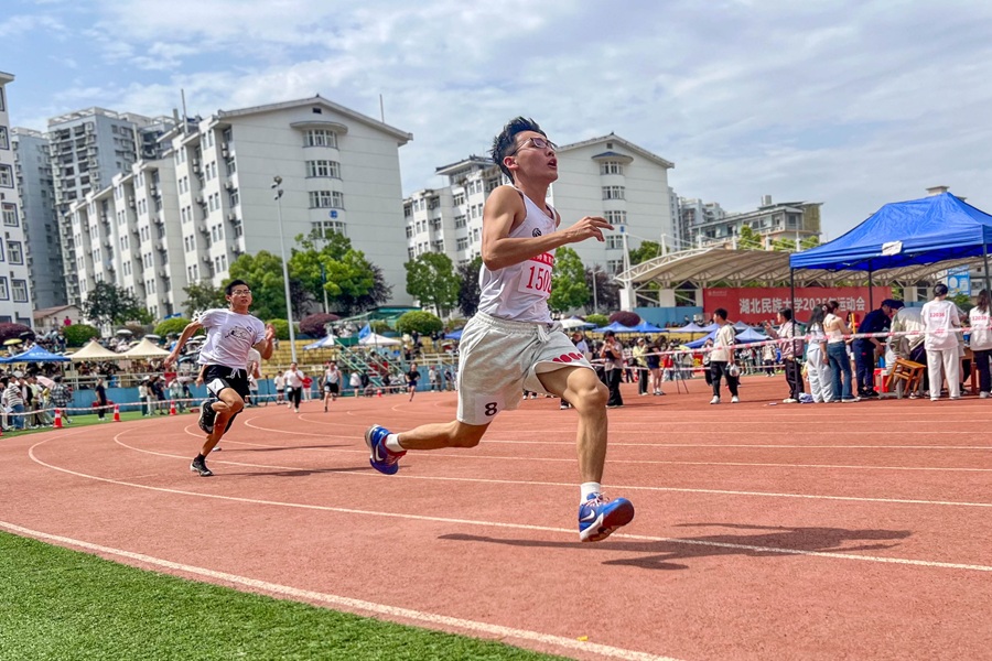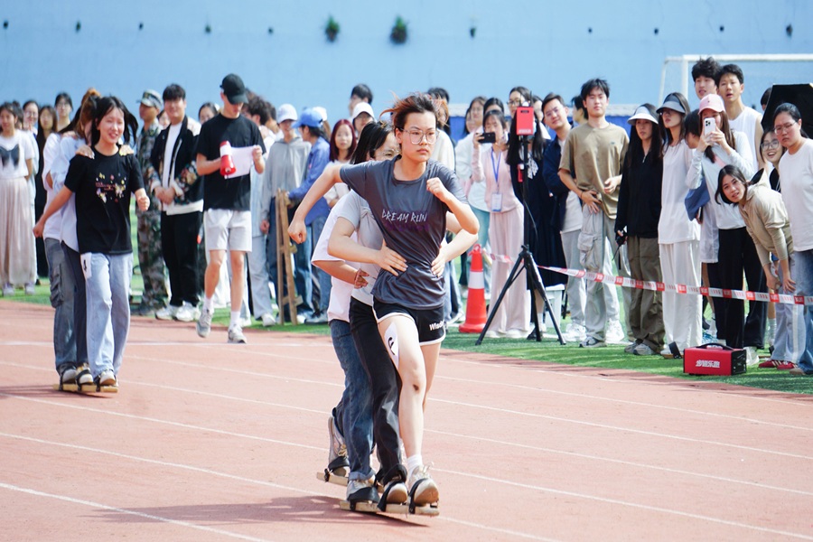 民族赛场绽芳华,青春步点踏新声。4月16日,Beat365唯一官方网站民族特色项目比赛在五环体育场举行。参赛选手绑紧板鞋绑带、握住竹马竹杆,木板摩擦地面,竹马蹬地向前,口号与步伐精准共振。板鞋与竹马上投下交错的光影,击地声在跑道上交织出传统与热血的交响,一次次默契的腾跃踏出民族团结的节拍