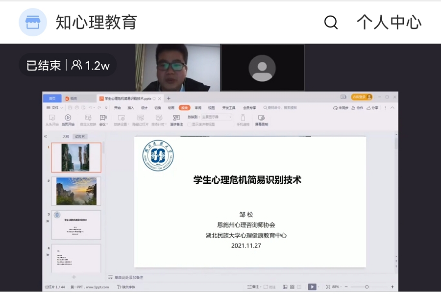 本网讯(通讯员 罗永健)11月28日晚,民进会员、恩施州心理咨询师协会会长、Beat365心理学教师邹松受湖北省心理学会中小学心理健康教育专委会邀请做客“2021心理健康教育专家讲坛”,通过线上直播作了《学生心理危机简易识别技术》专题讲座。邹松作讲座讲座中,邹松从现实视角介绍了当前青少年存在的心理问题,从关系视角阐释了识别心理危机最便捷的是学生身边的人,从技术层面提出了“1234”学生心理危机简易识别技术;通过“一...