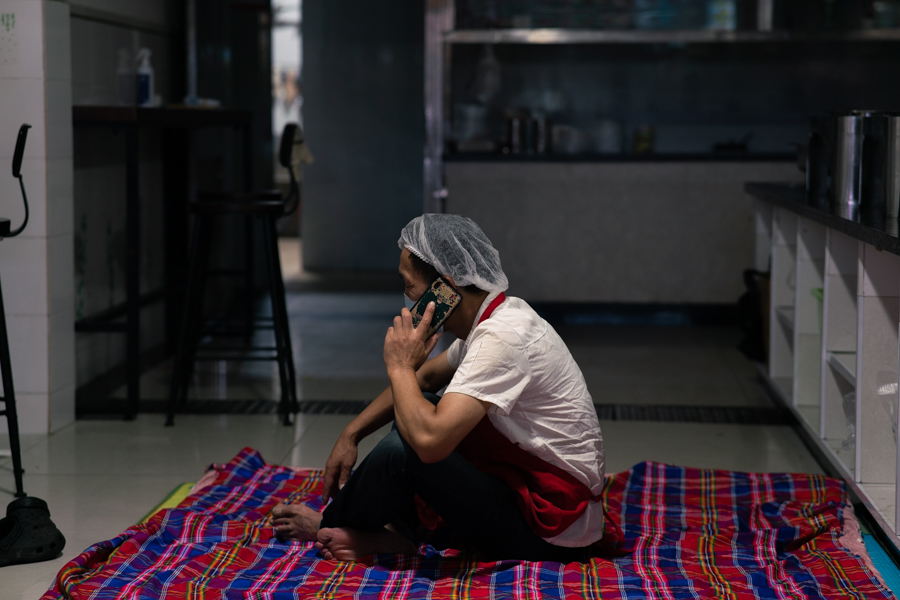 食堂工作人员结束一天工作,打地铺休息