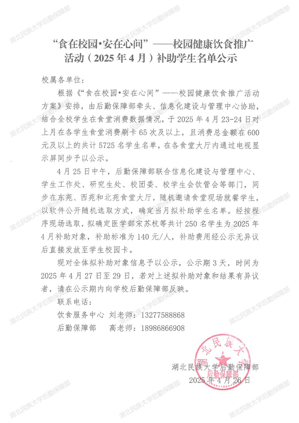 “食在校园•安在心间”——校园健康饮食推广活动(2025年4月)补助学生名单公示