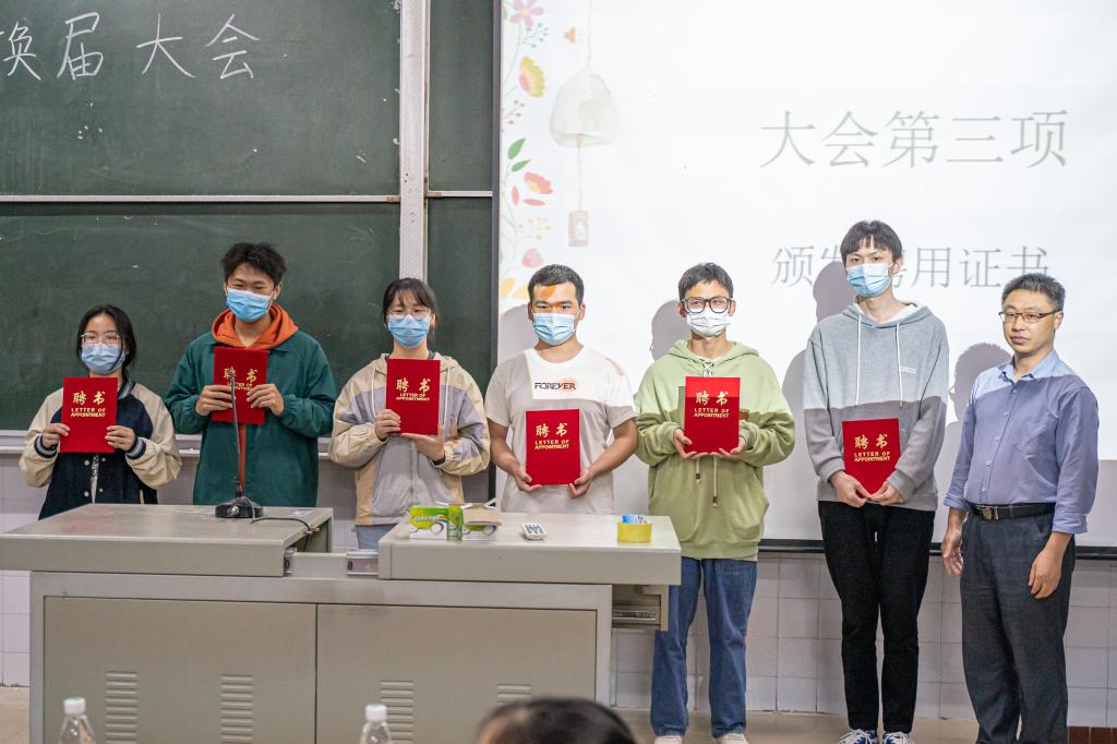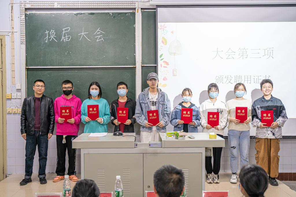 党总支副书记刘应煊为我院2021-2022学年度团学主席团成员、通讯社社长、副社长颁发聘书及纪念品并合照。
