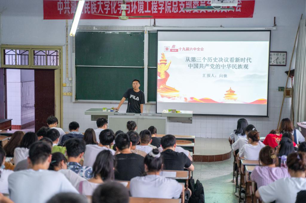 授课伊始,向驰以中国共产党第十九届中央委员会第六次全体会议为切入点引出主题并讲解中共十九届六中全会的主要内容。当他在讲到《中共中央关于党的百年奋斗重大成就和历史经验的决议》时特别强调“中华民族”一词共在其中出现53次,并提醒与会成员要正确认识中华民族观。而后,他分别以“以中华民族伟大复兴为主题的中华民族发展观”“以铸牢中华民族共同体意识为主线的中华民族整体观”“以平等团结互助为主流的中华民族和谐观”三个维度来阐述中华民族观。最后,他引用习近平总书记的讲话 “中华民族的昨天,可以说是‘雄关漫道真如铁’;中华民族的今天,正可谓‘人间正道是沧桑’;中华民族的明天,可以说是‘长风破浪会有时’。”以此告诫同学们要有无所畏惧,昂首阔步一路向前的坚定信心。