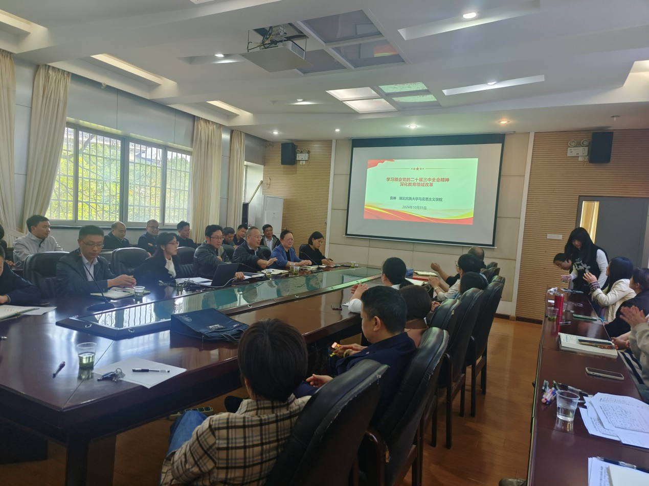 10月31日下午,我院在106会议室举办学习贯彻党的二十届三中全会精神专题宣讲会,会议特邀马克思主义学院袁琳副教授作为主讲嘉宾,由学院党总支书记桑秋章主持,全院教职工参加。