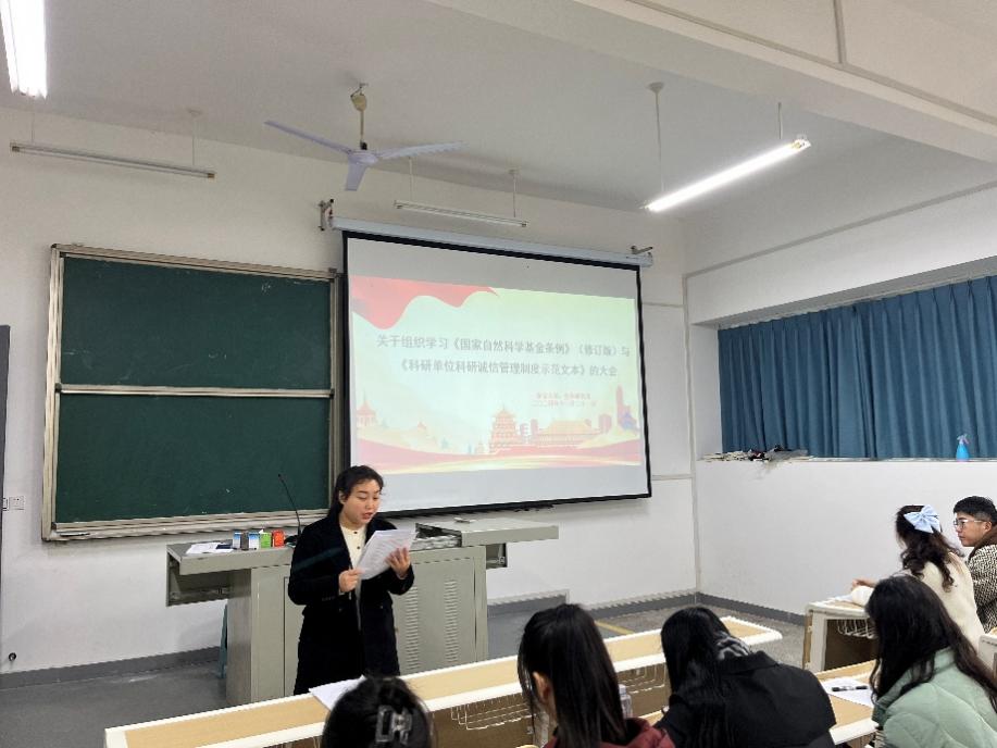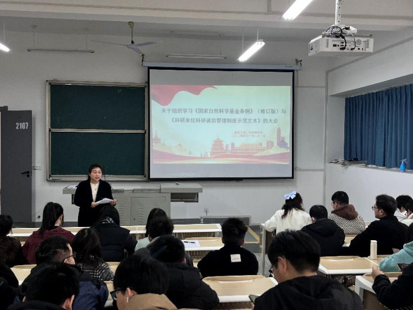 11月21日,为了加强科研人员对国家自然科学基金条例与科研诚信相关条例的学习,提升科研道德水平,一场意义非凡的科研诚信学习活动在化学与环境工程学院2107教室隆重举行。我院全体研究生参加此次活动,辅导员蒋筑阳老师担任主持人。