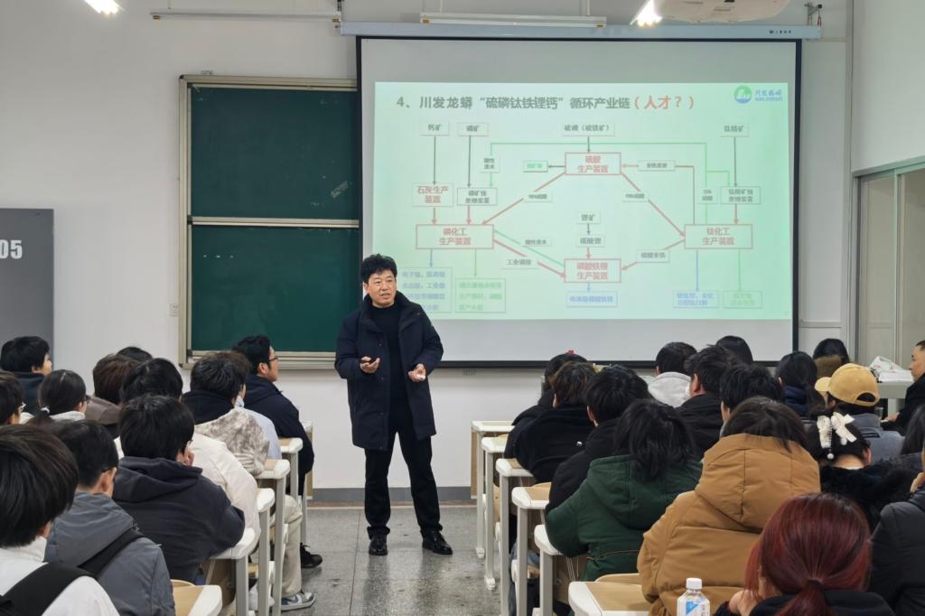 朱洪成也提出了当前化工行业发展存在的问题,如基础化工材料低端过剩,高端不足、石油危机等。在此基础上,他进一步分析了磷化工全产业链的高质量发展路径,详细介绍了“硫磷钛铁锂钙”循环产业链等新兴发展方向,并强调了自主创新和高端化工人才培养的重要性与紧迫性。面对未来化工行业发展的新机遇和新挑战,朱洪成鼓励学生积极投身到化工技术的研究与实践当中去,做到“思”“学”“律”“团”“志”“孝”,将个人的命运与国家的命运紧密联系在一起,不负韶华、不辱使命,做新时代的奋斗者。