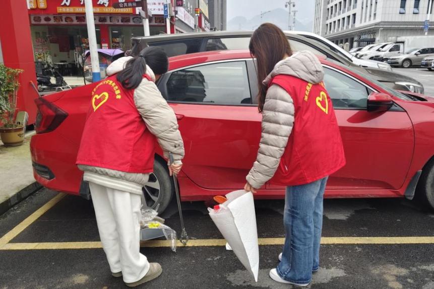 身穿红色马甲的志愿者们手持垃圾钳、扫帚等清洁工具,在社区广场迅速展开清洁行动。他们一丝不苟地清扫路面垃圾、捡起烟头,并清除墙面的小广告。与此同时,志愿者们还担任起“环保宣传员”的角色,通过互动问答、分发手册等方法,向居民普及垃圾分类和环保知识。