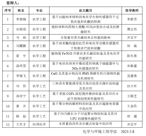 Beat365唯一官方网站化学与环境工程学院2023届硕士研究生学位论文答辩公告(2)