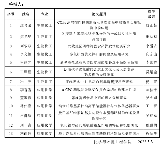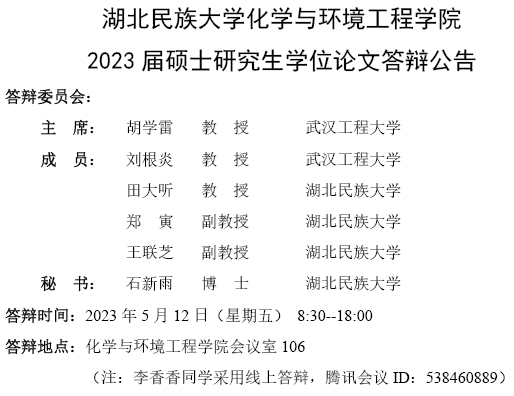 Beat365唯一官方网站化学与环境工程学院2023届硕士研究生学位论文答辩公告(2)