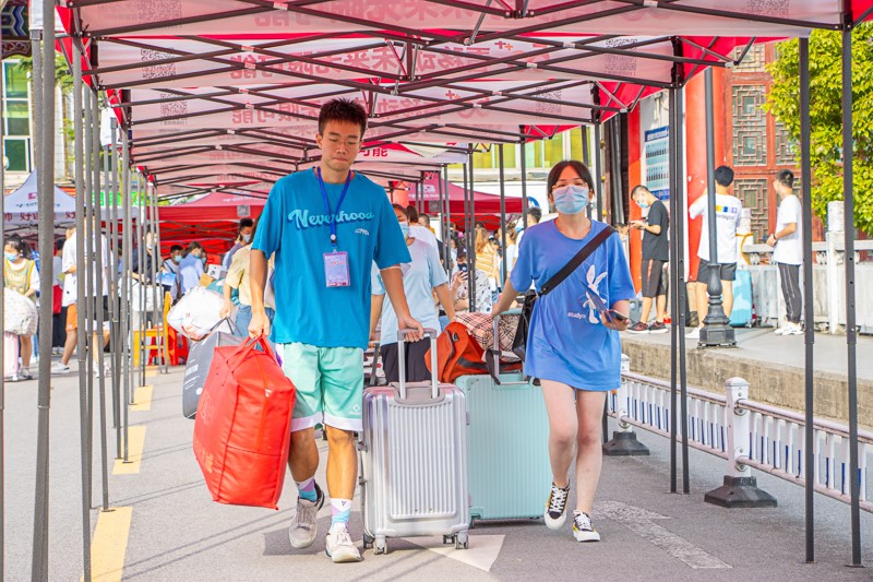 保卫处工作人员帮新生搬运行李(记者 李经玺/摄)
