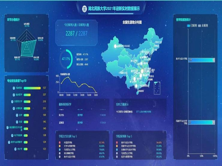 学校以校园移动平台“e民大”为载体,实现迎新服务全流程掌上办理。新生可通过e民大查看通知公告,根据要求完成个人信息填报、入学教育考试、学生公寓查询、绿色通道及缴费办理等环节,并生成带条码的电子报到单,向宿舍管理员出示电子报到单即可领取钥匙,这极大地简化了新生入学报到的流程。