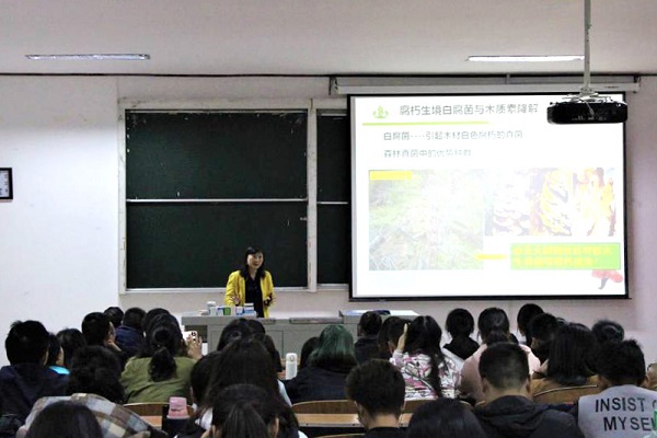 她以“公基质的降解”为切入点,展开“共基质降解转录组学研究”“共基质促进白腐菌染料降解机制”“基于共代谢的白腐菌环境修复工艺”等内容的讨论。她强调,在共基质体系下,木质素诱导木质素降解酶及相关酶系的表达与相互作用促进白腐菌对物质与木质素的降解。她列举出木腐菌生物转化葛根渣、木腐菌生物转化魔芋、荻竹渣生物胶粘制备等一系列例子,说明其在生产食用保健品方面的作用。随后,该院师生就“白腐菌降解和自然降解的耗时长短”等问题与张晓昱进行交流。