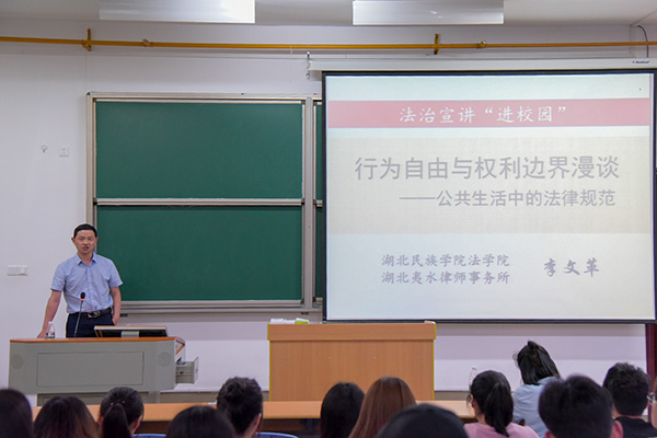 李文革从“关于行为自由”“法律与自由”“公共生活的法律规范”“权利边界限定”四方面展开讲学。