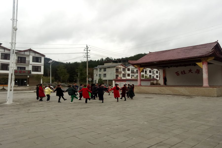 村民在修葺一新的百姓大舞台前载歌载舞