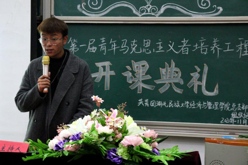 本网讯(记者 林惠珠 见习记者 赵雪 许林珍/文 刘玉琳/图)2020年11月19日晚,经济与管理学院第一届马克思主义者培养工程开课典礼在修远楼5B509教室举行。经济与管理学院党委书记张新平,学生科科长曹骞,学生科辅导员向绍阳、覃杰、解丽娟应邀出席,团总支书记张典担任主持。