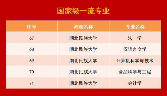 经过多年的建设和发展,积累了较为丰硕的专业成果:2015年,会计学专业被列为湖北省“专业综合改革”试点专业;2017年,获批“荆楚卓越经管人才协同育人计划”;2018年,获“湖北省教学成果二等奖”(地方民族高校经管类应用型人才塔型实践教学体系探索与实践),增列“会计硕士专业学位授权点”;2019年,会计学专业获评“湖北省一流本科专业建设点”,“会计实践创新能力教学团队”获评“湖北高校省级教学团队”;2021年,《会计学基础》和《中级财务会计》分别被认定为“湖北省一流课程”,“会计学教研室”获评“湖北省本科高校优秀基层教学组织”。2022年,入选2021年度国家级一流本科专业建设点名单。