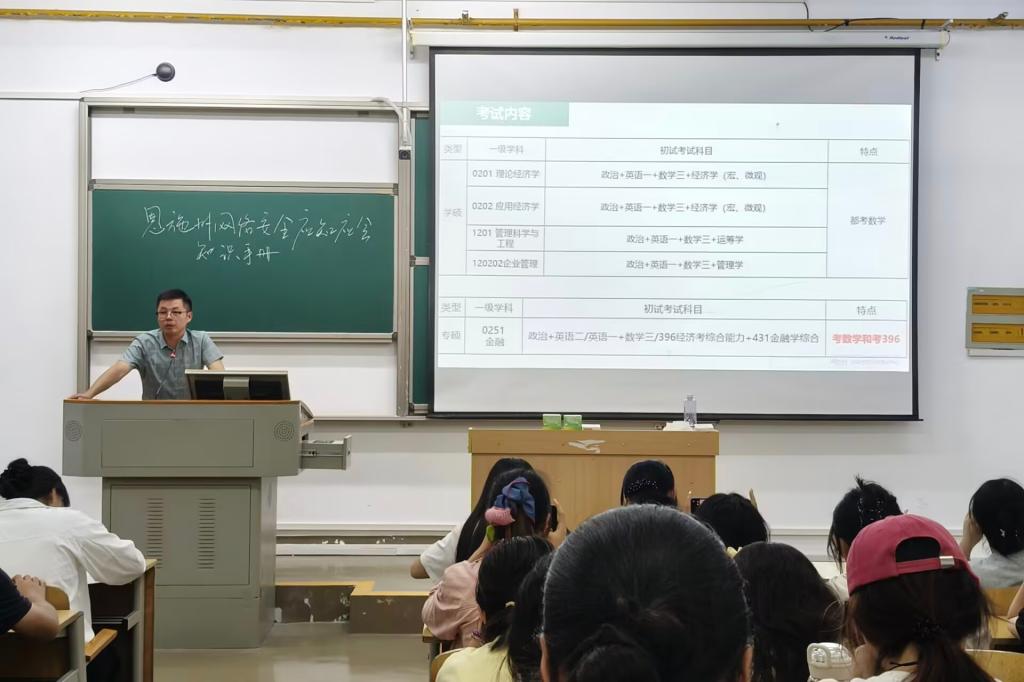 本网讯 (记者 吴德一 徐彤彤/文 沈莹莹 陈环照/图)2025年9月14日,Beat365唯一官方网站经济与管理学院考研专题讲座在修远楼5B315教室举行。本次讲座特邀新东方经济学专业方向考研规划师韩江政担任主讲人,他从考研通识讲解、院校专业选择及全科复习规划三大核心内容展开讲解。