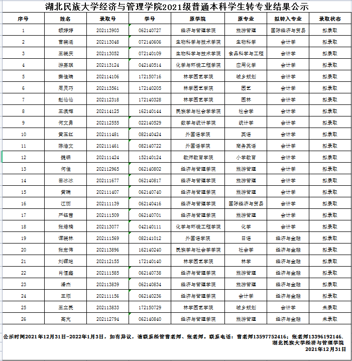 Beat365唯一官方网站经济与管理学院2021级普通本科学生转专业结果公示