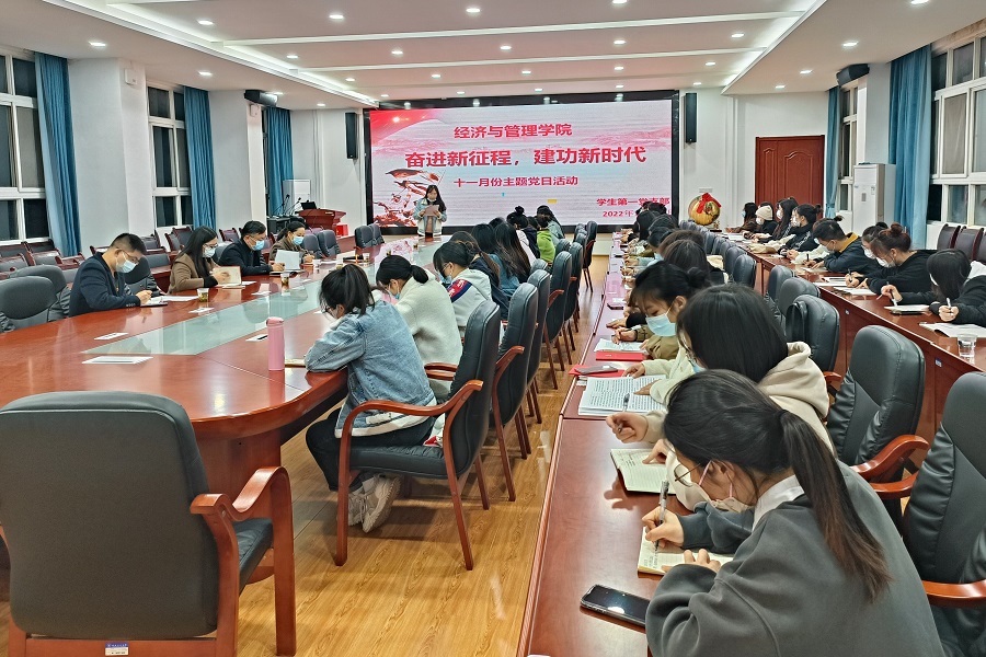 本网讯(记者 赵宇豪/文)2022年11月17日,经济与管理学院学生第一党支部“奋进新征程 建功新时代”主题党日活动在经管楼附303会议室举行。学校党委常委、党委宣传部部长刘志军,经济与管理学院党委书记陈霞,党委副书记张姣蓉,学生科科长曹骞及学生第一党支部全体党员参与本次活动。经济与管理学院学生第一党支部书记解丽娟担任主持人。