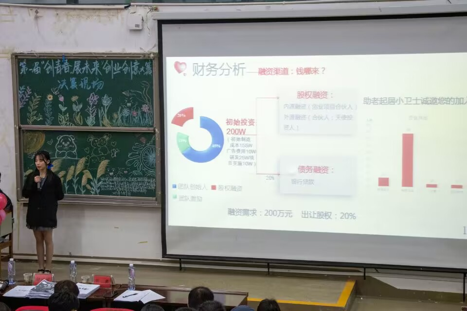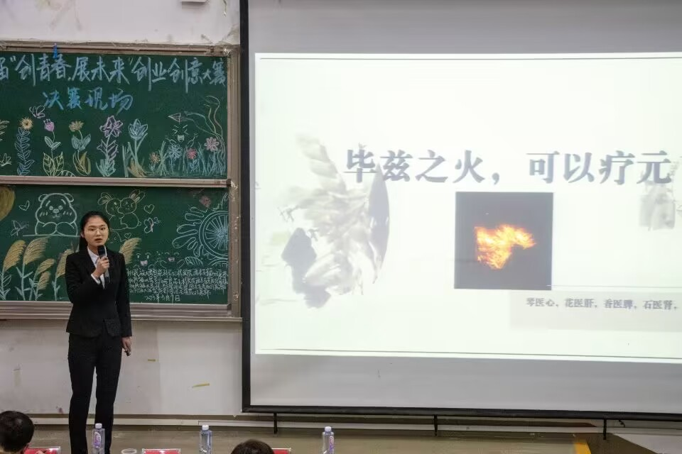 在项目展示环节中,第九组以“银发帮手—智能多功能轮椅床”为题,介绍该产品具有集多种功能为一体的特色,并从资金风险、管理风险、市场风险、技术风险四个方面展开分析,清晰展现团队的财务计划;第三组“毕兹之火,可以疗元”以健康中国战略作为支持,将土家火攻疗法技艺与中外优秀医疗技术相结合,展示土家医药文化的优势;第七组介绍项目“西兰卡普”,从线下服务、衍生服务、设计服务、定制服务四个方面对盈利模式展开讲解。