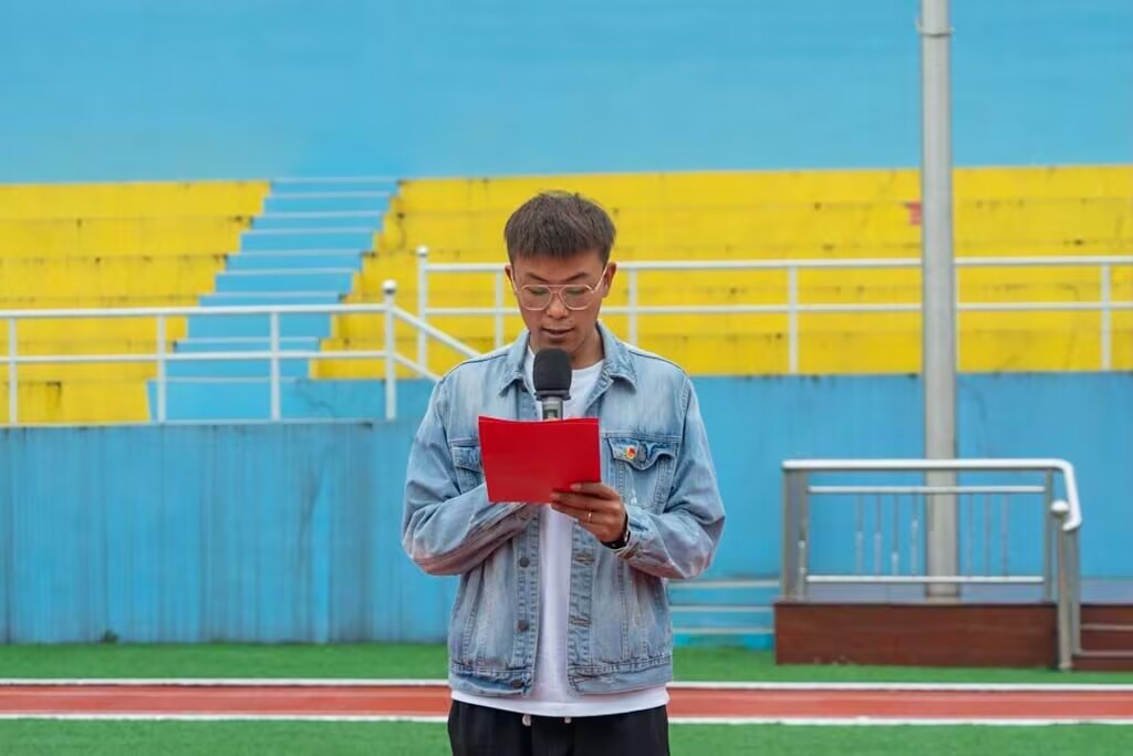 学生代表黄彬发言。她从五四精神出发,呼吁学生响应时代号召,探索科学、心系国家,立志做有理想、敢担当、肯奋斗的新时代好青年。