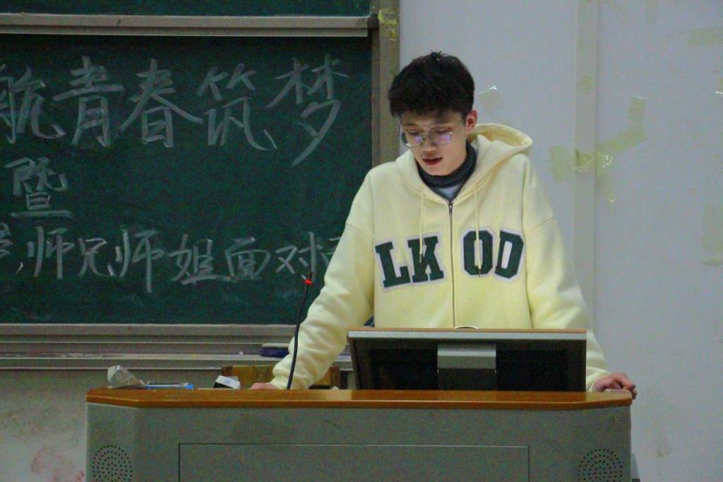 国家奖学金获得者李思宇发言。他表示,国家奖学金是对自己努力学习实现自我的肯定,一分耕耘一分收获,提醒学生要明确自我定位、端正学习态度,不骄不躁,沉着理性,知行合一,扬使命之帆。